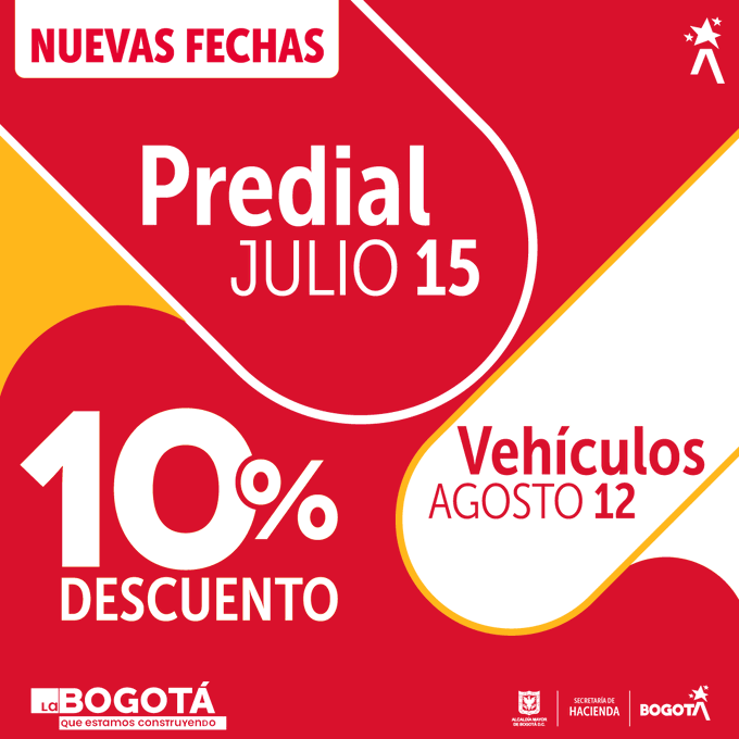 Imagen: Secretaría de Hacienda El pago sin descuento para impuesto predial es hasta el 12 de agosto 2022. Publicado por: Juan Manuel Vásquez Ardila La Administración distrital informa a los contribuyentes que hasta el 15 de julio podrás pagar tu impuesto predial 2022 con el 10% de descuento por pronto pago; y hasta el 12 de agosto, sin […]